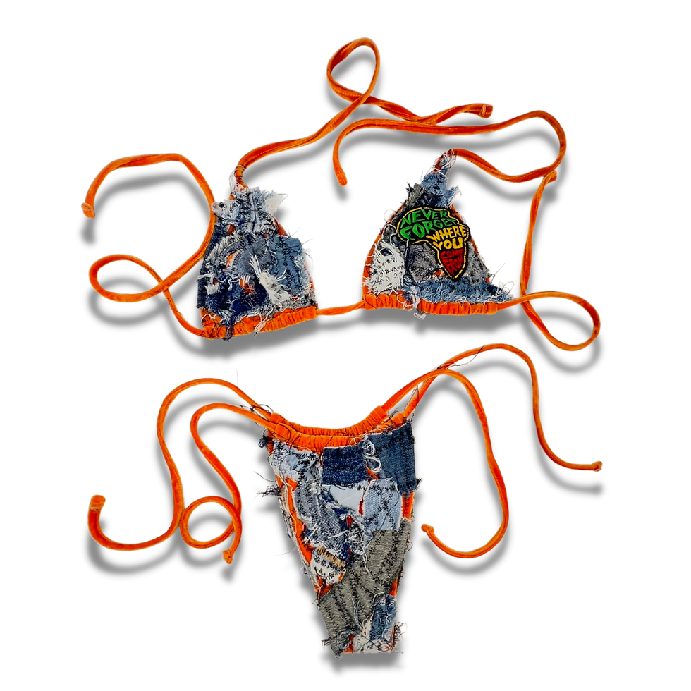 DON'T STRESS, DISTRESS ORANGE & BLUE DENIM BIKINI
